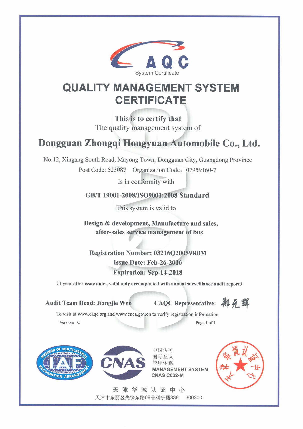 2016年1月14日,天津華誠(chéng)認(rèn)證中心相關(guān)評(píng)審專家對(duì)我司質(zhì)量管理體系認(rèn)證進(jìn)行二階段審查考核,順利通過(guò)了我司客車設(shè)計(jì)開(kāi)發(fā)、制造及銷售、售后服務(wù)等認(rèn)證范圍的考核,并于2月26日正式授予質(zhì)量管理體系認(rèn)證證書。質(zhì)量管理體系標(biāo)準(zhǔn)的實(shí)施,是對(duì)公司各項(xiàng)管理工作規(guī)范化、標(biāo)準(zhǔn)化的全面檢測(cè),是公司持續(xù)穩(wěn)定發(fā)展的重要保證,宏遠(yuǎn)汽車將持續(xù)推動(dòng)質(zhì)量管理體系實(shí)施工作,進(jìn)一步完善和優(yōu)化管理。